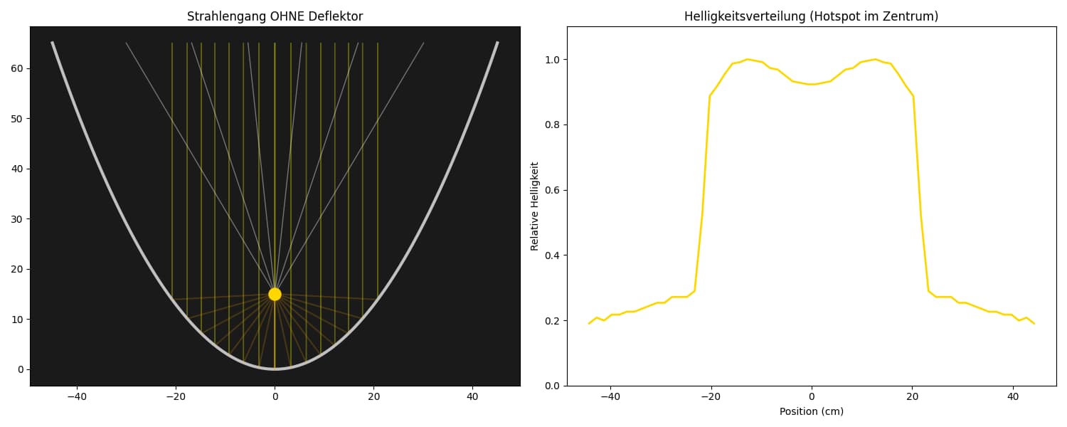 ax2.set_title("Helligkeitsverteilung (Hotspot im Zentrum)")
