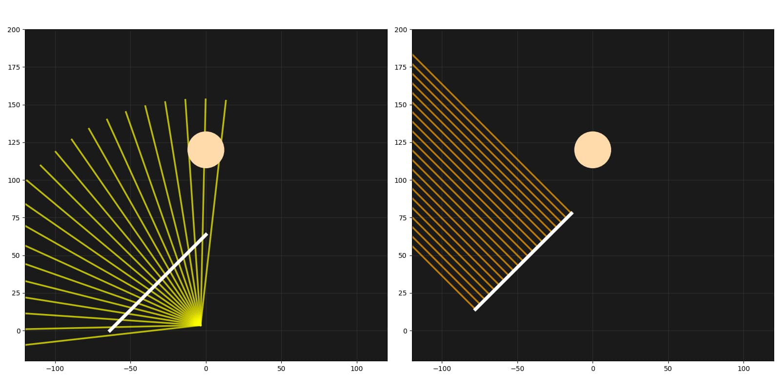 def ray_trace_softbox(diameter=90, depth=65, num_rays=25, focal_point_y=1):