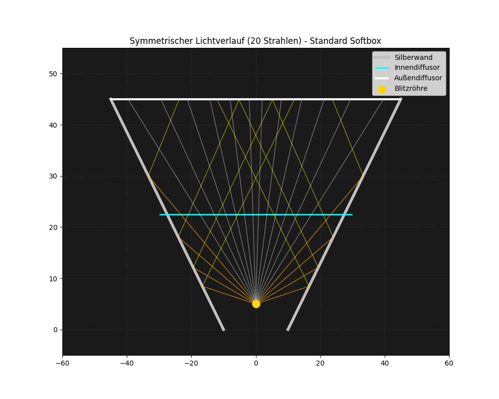 ax.set_title("Symmetrischer Lichtverlauf (20 Strahlen) - Standard Softbox")